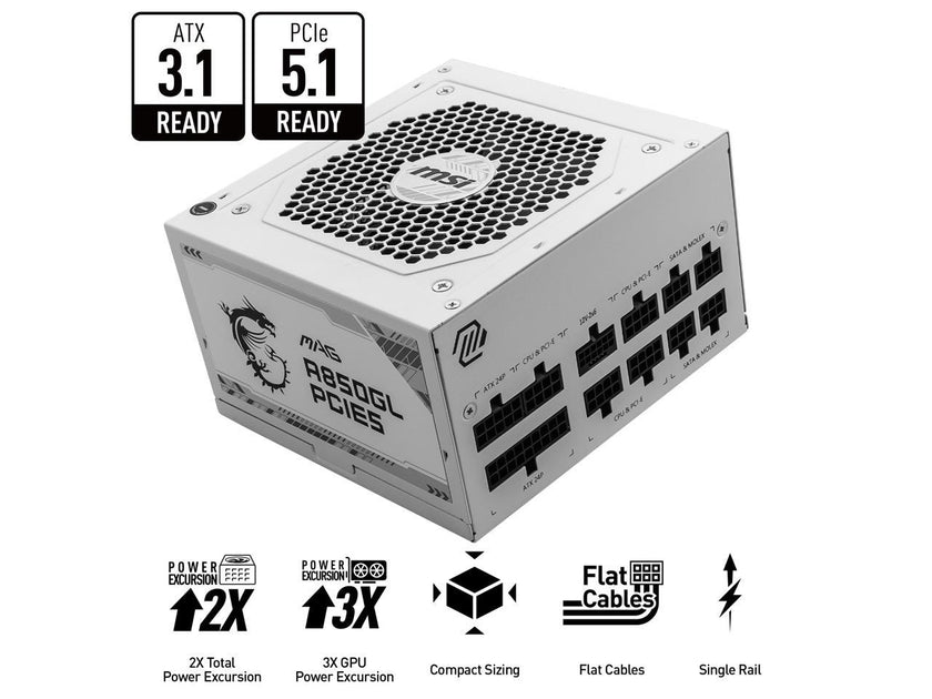 MSI MAG A850GL PCIE5 White, Fully-Modular, 80 Plus Gold, 850W Power Supply